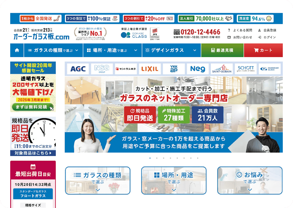 ガラスや鏡など、細かなニーズに応える資材ジャンル別の専用ECサイトや、ガラスの情報を発信するメディアサイトを制作・運営。性能・価格に応じた数百点の商品を、種類や使用場所、用途、お悩みといった切り口から絞り込み、自分に合った商品を選べる構成としている。また、サイズオーダーをミリ単位で指定できる点も特長。現在は6つのサイトを運営し、デザインや構成を比較・検証しながら、継続的に改善・アップデートしている。