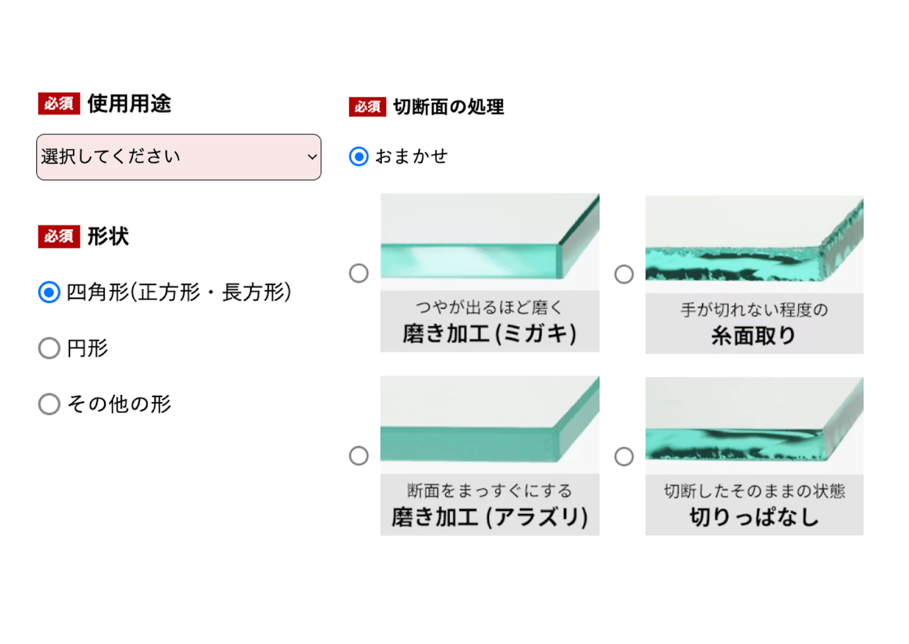 ガラスの用途は、曖昧な要望からサイズが決まったものまでさまざま。こうした幅広いニーズに対応するため、商品ごとにカスタマイズしたお見積りフォームを制作している。用途・形状・加工の順に選択肢が絞られる設計に加え、「お任せ」選択や図面・写真による依頼など、使いやすさにも工夫している。