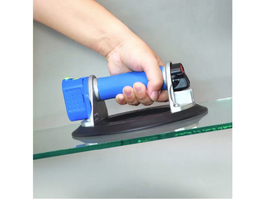 電動ガラス吸盤は、スイッチ一つで吸着・解除ができるのが特長です。従来の手動ポンプ式では繰り返し行う必要があった作業が簡略化され、より安全かつスピーディーにガラスを取り扱うことが可能になります。ガラス施工の現場では一人あたりの作業負担が大きく、長時間の作業が続くことも多いため、電動化による効率改善が期待されています。